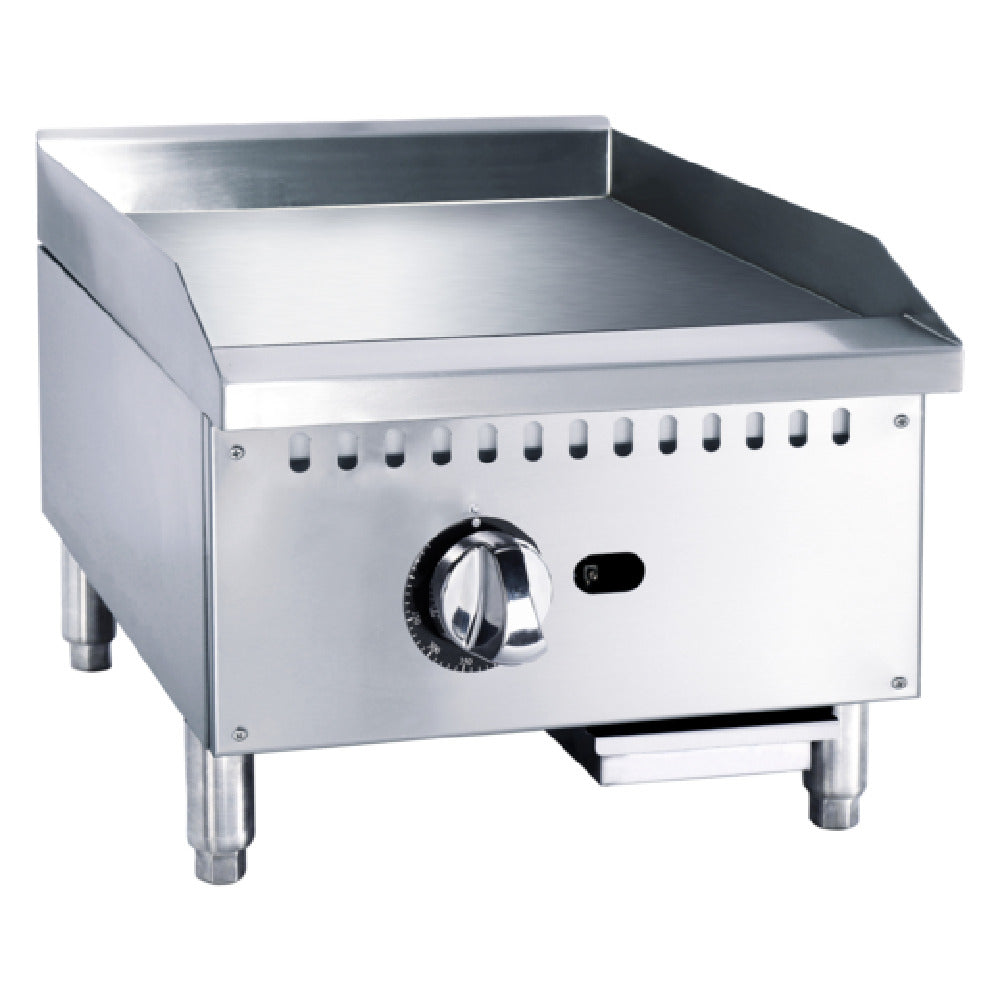 The Admiral Craft BDECTG-16/NG Black Diamond Gas Griddle is a compact yet powerful countertop appliance, measuring 16"W x 22-3/4"D, designed to meet the demands of diverse cooking environments. Its standout feature is the 5/8" thick smooth steel plate, which ensures even heat distribution for consistent cooking results. This gas griddle is equipped with a single manual burner control, delivering a robust 30,000 BTU, suitable for high-efficiency cooking tasks. Constructed with a durable stainless steel front and sides, it also features splash guards and a grease trough for added convenience and cleanliness. The stainless steel drip tray enhances its ease of use, preventing mess and facilitating effortless maintenance. Adjustable legs allow for customizable height settings, making it adaptable to various countertop configurations. The product includes tips for field conversion to LPG, offering flexibility in fuel source options. The rear 3/4" NPT connection ensures a secure gas line hookup. Certified by cETLus and ETL-Sanitation, this griddle meets rigorous safety and sanitation standards, affirming its suitability for professional kitchens. The Admiral Craft BDECTG-16/NG is an essential tool for chefs and culinary professionals seeking reliability and precision in a compact gas griddle solution.