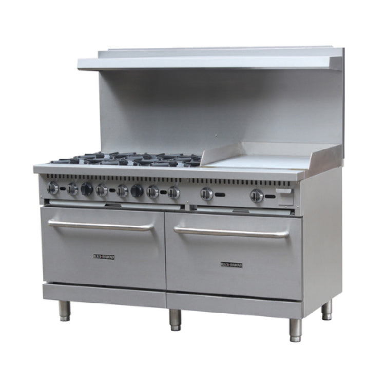 The Admiral Craft BDGR-6024G/NG Black Diamond Range With Griddle Natural Gas 60" is a high-performance kitchen appliance designed for demanding culinary environments. It features six 12" x 12" top burners, each delivering a powerful 30,000 BTU output, ensuring rapid and efficient cooking. The removable cast iron top grates and individual pilot lights and controls provide precise heat management, catering to varied cooking needs. The range is equipped with two standard ovens, each offering a temperature range from 150°F to 550°F and includes two adjustable racks per oven, enhancing versatility in baking and roasting. The 24"W x 21"D griddle cooktop, with a substantial 3/4" thick griddle plate, provides ample space for grilling, while the stainless steel construction underpins durability and easy maintenance. The removable crumb tray and backriser with shelf add to its practicality and convenience. Supported by six adjustable legs for stability and a 280,000 BTU total output, this gas range is ideal for professional kitchens. It also meets cETLus and ETL-Sanitation standards, assuring quality and safety compliance. Engineered for high-volume food service operations, the Admiral Craft BDGR-6024G/NG Black Diamond Range embodies reliability and efficiency in one robust package.