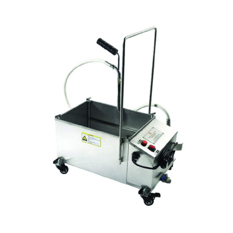 The Admiral Craft BDOF-75 Oil Filtration System is an advanced and portable filtration solution, designed to support diverse operational needs within the food service industry. Featuring an 18" x 13" chamber, this system can handle up to 75 lbs of oil, efficiently pumping oil at a rate of 1.32 gallons per minute. The device includes a 10.6-gallon capacity filtering chamber, ideal for high-volume operations. Its flexible 5' filtering hose comes equipped with a stainless steel nozzle, ensuring durability and ease of use. Construction of the unit is primarily in stainless steel, providing robust strength and longevity. The BDOF-75 is engineered with a fold-down handle and low-profile design, which, coupled with four swivel casters—two of which are locking—facilitates easy transport and stability. Additional components like a stainless steel gasket, filter mesh, and rubber gasket enhance its filtration precision. A separate on/off power switch and a start/stop pump button offer intuitive operation. This unit operates on 120v/60/1-ph with a power consumption of 300 watts and features a 1/3 HP motor, adhering to NEMA 5-15P standards and CE certification. The inclusion of filter papers and powder further augment its efficiency, making it a valuable asset for maintaining optimum oil quality in food preparation settings.