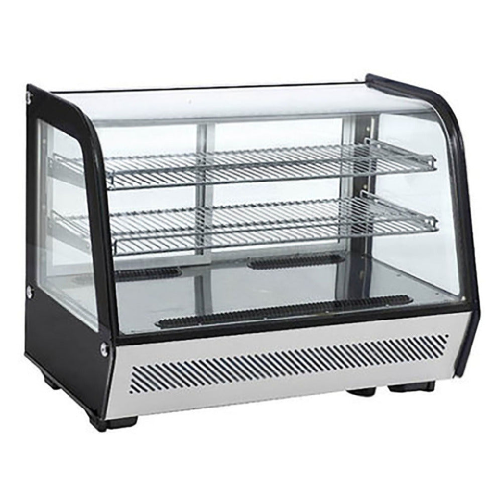 The Admiral Craft BDRCTD-160 Black Diamond Refrigerated Display Case Countertop 35"W is a meticulously designed refrigeration solution ideal for retailers and food service businesses requiring efficient display and preservation of perishable goods. With a capacity of 5.2 cubic feet, this unit ensures ample space for a variety of chilled items while fitting seamlessly onto countertops. It boasts a bottom mount self-contained refrigeration system that maintains temperatures between 32°F and 53.6°F, managed by a digital temperature controller and display for precise monitoring. The automatic defrost feature aids in maintaining optimal performance without manual intervention. Designed with practicality in mind, the display case features two sliding glass doors and two adjustable shelves, allowing for easy access and customizable storage arrangements. Its curved front glass and glass sides, enhanced by energy-efficient LED lighting, provide excellent visibility of displayed items, enhancing product presentation. Constructed with durable stainless steel, the unit not only ensures longevity but also complements the aesthetic of modern commercial environments. Operating on R290 refrigerant, it is environmentally friendly and efficient. The unit requires a 110v/60/1-ph power source, drawing just 3 amps, and is CE certified, affirming its adherence to European safety standards.