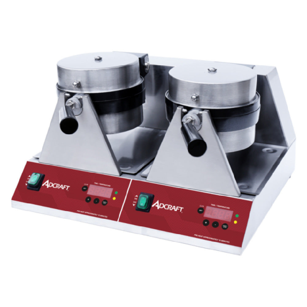 Admiral Craft Equipment Corp., BWM7R2S, Adcraft Belgian Waffle Maker, double, 7" round grids, 1-1/4" thick waffles, cook 40 waffles per hour, individual controls, stainless steel body, cast aluminum non-stick coated grids, temperature range 255° to 450° F, 180° rotating hinge, digital timer with buzzer, lighted on/off switch, includes: removable stainless steel drip pan, 120v, 2000 watts, 16.6 amps, (2) NEMA 5-15P, cETLus, ETL Sanitation