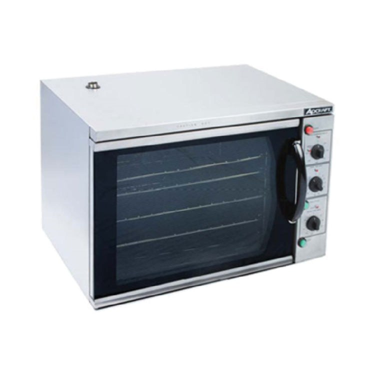 The Admiral Craft COH-3100WPRO Professional Convection Oven - heavy duty stainless steel with small footprint design for all countertops, is an exceptional appliance tailored for varied culinary needs. With its robust 3100 watt power and 14 amps, this oven operates on 220v/60/1-ph, ensuring efficient energy use, and is equipped with a NEMA 6-20P plug. The versatile temperature range of 120-500°F, complemented by a cook and hold feature that maintains food warmth for up to 180 minutes, caters to diverse cooking requirements. The oven's capacity to accommodate four half-size sheet pans with 3-5" spacing between shelves offers ample space for multiple dishes. Its design includes double wall glass doors for enhanced insulation, a 60-minute timer for precise cooking management, and an interior light for better visibility. Measuring at 22" in height, 31" in width, and 21.5" in depth, this convection oven's compact dimensions make it suitable for any countertop. The inclusion of manual control knobs ensures user-friendly operation, while the grill/broil and roasting function, reaching up to 570°F, adds to its versatility. Certified by CE and NSF, this oven adheres to industry standards, making it a reliable choice for both commercial kitchens and home cooking enthusiasts.