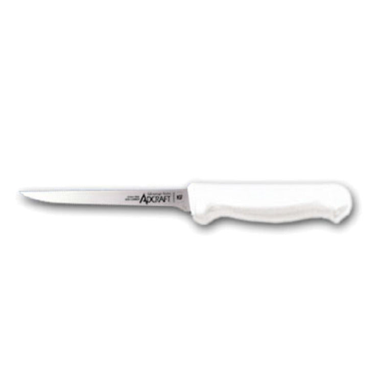 The Admiral Craft CUT-6NBWH Advantage Series™ Stiff Boning Knife 6" Narrow is a professional-grade tool designed for precision and durability. Featuring a 6-inch narrow, straight edge, this knife is crafted from high-carbon steel, ensuring excellent stain resistance and long-lasting sharpness. The knife is equipped with a polypropylene handle, offering a comfortable grip and maintaining its structural integrity when exposed to moisture. This handle is also a practical choice for environments where hygiene is paramount, as it is dishwasher safe, making cleaning efficient and hassle-free. The CUT-6NBWH is NSF certified, ensuring it meets rigorous public health and safety standards, a vital consideration for commercial kitchens and culinary professionals. This boning knife is individually blister packed, making it ideal for both retail and wholesale markets. Its technical design and construction make it a versatile choice for meat processing industries, catering businesses, and professional chefs seeking a reliable tool for precise and safe meat deboning tasks. The pristine white design of the knife adds a touch of elegance, while its robust functionality underscores its value across different segment markets within the culinary industry.
