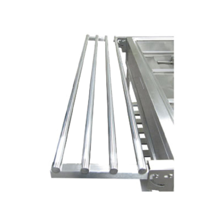 The Admiral Craft EST-240/TH Tray Slide Shelf is a meticulously engineered piece designed for practical utility in various food service settings. Measuring 57-1/4 inches in width, 14 inches in depth, and 2 inches in height, this tray slide shelf offers ample surface area for efficient tray management. It is constructed from high-quality stainless steel, ensuring durability and resistance to corrosion, making it a reliable choice for environments that demand frequent cleaning and maintenance. The 4-rail design is a standout feature of this tray slide shelf, providing enhanced stability and support for trays, making it an invaluable asset for cafeterias, bakeries, and commercial kitchens. The robust construction and thoughtful design cater to the needs of different market segments within the food service industry, from high-volume institutions to smaller, boutique establishments. With its precise dimensions and sturdy build, the Admiral Craft EST-240/TH Tray Slide Shelf is not only a practical addition to any kitchen layout but also a testament to Admiral Craft Equipment Corp.'s commitment to quality and innovation in kitchen solutions.
