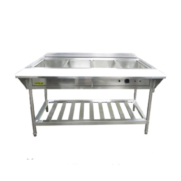 The Admiral Craft EST-240 Water Bath Steam Table stands out as a reliable and versatile solution for various commercial kitchen environments. With dimensions of 57-1/4"W x 26"D x 34-1/4"H, it features four compartments, each measuring 12" x 20" x 8-1/2" deep, catering to diverse culinary needs. This steam table is equipped with a thermostatic control dial for precise temperature management, enhancing food safety and quality. A low water cutoff sensor featuring a reset button ensures operational safety and protection of the equipment. Constructed with a fully welded 304 stainless steel water pan, it guarantees durability and resistance to corrosion, ideal for high-demand settings. The Admiral Craft EST-240 utilizes a single heating element and operates on a power rating of 3000 watts, compatible with 208v/240v/60/1-ph, drawing 12.5 amps, and connecting via a NEMA 6-20P plug. Additional features include adjustable legs with bullet ends for stability and an undershelf for added storage convenience. A 3/4" drainage pipe facilitates easy maintenance and cleaning. Certified by CE, this steam table ships knocked-down, simplifying transportation and setup. Its robust construction and efficient design make it a valuable asset for catering services and institutions demanding reliable food service solutions.