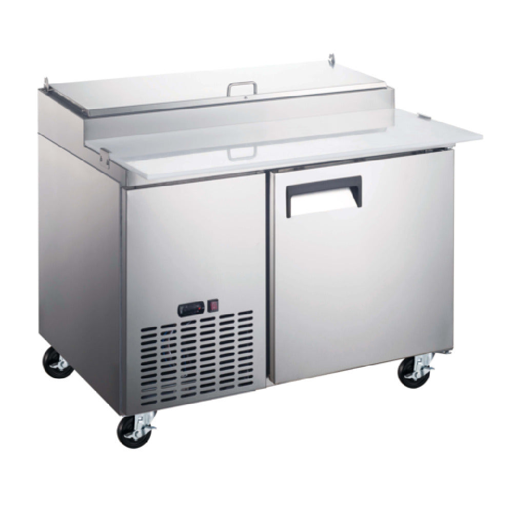 The Admiral Craft GRPZ-1D Grista Refrigerated Pizza Prep Table is a robust and efficient solution for commercial kitchens, particularly in the pizza-making industry. This 1-section unit measures 50"W x 31-1/2"D x 43"H and offers a 10 cu.ft. refrigeration capacity. It features a side mount self-contained refrigeration system with a digital temperature controller and LED display, ensuring precise control over a temperature range of 33°F to 41°F. The unit is equipped with auto defrost, enhancing its operational efficiency. With its insulated hinged lid and 19" deep x 3/4" thick polyethylene cutting board, it provides convenience and ease for food preparation. The interior is made of painted aluminum, while the exterior is crafted from 430 stainless steel, ensuring durability and resistance to corrosion. The table includes one adjustable plastic coated steel shelf and a self-closing door with a recessed handle for secure storage. Mobility is facilitated by four 4" casters, two of which are locking. Utilizing R290 refrigerant and operating with 1/6 HP, 115v/60/1-ph, 4.5 amps, the unit is energy-efficient and ETL-Sanitation listed, making it suitable for various food service environments that prioritize both functionality and food safety compliance.