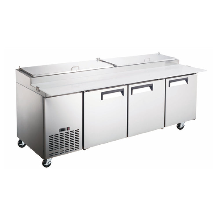 The Admiral Craft GRPZ-3D Grista Refrigerated Pizza Prep Table is a versatile 3-section unit, measuring 92"W x 31-1/2"D x 43"H, designed for the demanding needs of commercial kitchens. With a generous capacity of 24 cubic feet, this prep table integrates a side mount self-contained refrigeration system that operates within a temperature range of 33°F to 41°F, controlled via a digital temperature controller with an LED display. Its auto-defrost feature ensures maintenance efficiency. The unit includes three adjustable plastic-coated steel shelves and a 19" deep x 3/4" thick polyethylene cutting board, providing ample space for ingredient preparation and storage. Built for durability and ease of use, it features an insulated hinged lid and three self-closing doors with recessed handles, ensuring energy efficiency and convenience. The interior is lined with painted aluminum, while the exterior boasts a robust 430 stainless steel construction. Mobility is facilitated by six 4" casters, with three being locking for stability. The table runs on R290 refrigerant with a 1/4 HP motor, operating on 115v/60/1-ph with a 7.2-amp draw, and includes a NEMA 5-15P plug. Certified by cETLus and ETL-Sanitation, it stands as a reliable choice for professionals in the food service industry.