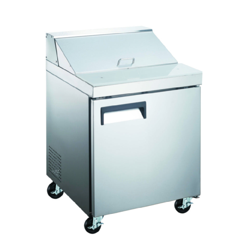 The Admiral Craft GRSL-1D Grista Refrigerated Salad/Sandwich Prep Table 1-section is a compact and efficient solution for foodservice environments requiring precise refrigeration and prep work. Measuring 27-1/2 inches in width, 29-1/2 inches in depth, and 42-1/4 inches in height, this unit offers a 6 cu.ft. capacity, making it ideal for a range of kitchen setups. Its rear mount self-contained refrigeration ensures consistent cooling, supported by a digital temperature controller with an LED display, maintaining temperatures between 33°F and 41°F. The table includes an auto-defrost feature, ensuring minimal maintenance disruption. For versatility, it features an adjustable plastic-coated wire shelf and an insulated hinged lid, providing efficient storage and accessibility. A 10-1/2 inch deep, 3/4 inch thick polyethylene cutting board enhances its functionality for food prep. The single self-closing door, equipped with a recessed handle, emphasizes ease of use. With a painted aluminum interior and a 430 stainless steel exterior, durability is ensured. Mobility is facilitated by four 4-inch casters, two of which are locking. Built with R290 refrigerant and operating on 115v/60/1-ph power at 4.4 amps, it includes a NEMA 5-15P plug. The unit is cETLus and ETL-Sanitation certified, and it comes with clear plastic food pans included.