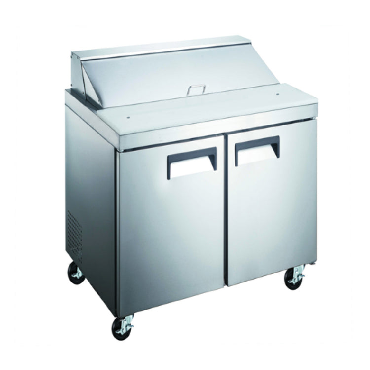The Admiral Craft GRSL-2D/36 Grista Refrigerated Salad/Sandwich Prep Table is a versatile 2-section unit meticulously designed for efficiency in commercial kitchens. Measuring 36-1/4"W x 29-1/2"D x 42-1/4"H, this prep table provides a generous 9 cu.ft. capacity, catering to various foodservice needs. It features rear-mount self-contained refrigeration powered by a 1/5 HP motor, utilizing R290 refrigerant to maintain a consistent temperature range of 33°F to 41°F. The digital temperature controller with LED display ensures precision, while the auto defrost function aids in maintenance. The interior, painted in aluminum, accommodates two adjustable plastic-coated wire shelves for flexible storage solutions. Externally, it boasts a 430 stainless steel finish for durability and easy cleaning. The prep table is equipped with an insulated hinged lid and a 10-1/4" deep x 3/4" thick polyethylene cutting board, providing a robust workspace. The two self-closing doors with recessed handles enhance accessibility, complemented by four 4" casters (2 locking, 2 non-locking) for mobility and stability. This table is rated at 115v/60/1-ph, 5.2 amps, and is fitted with a NEMA 5-15P plug. With cETLus and ETL-Sanitation certifications, the GRSL-2D/36 is an exemplary choice for reliability and performance in food preparation environments. Clear plastic food pans are included for immediate use.