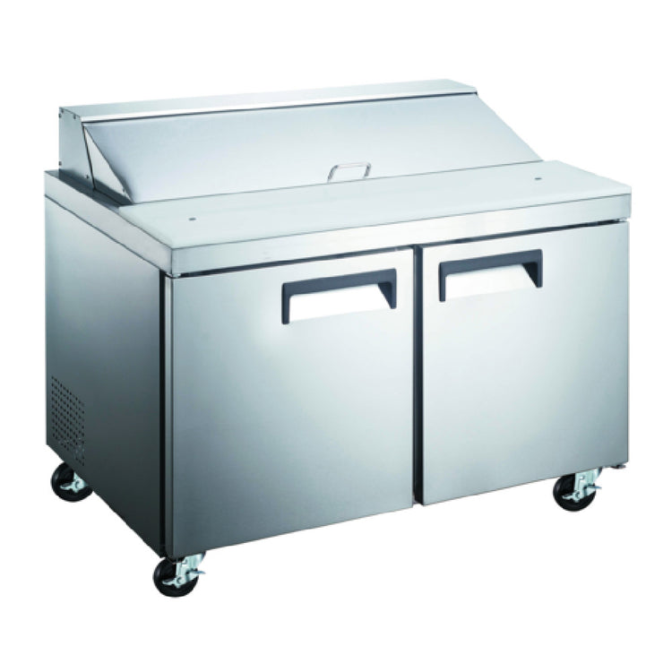 The Admiral Craft GRSL-2D/60 Grista Refrigerated Salad/Sandwich Prep Table is a versatile and robust solution designed to meet the needs of various food service operations. With dimensions of 60"W x 29-1/2"D x 42-1/4"H, this 2-section unit offers a substantial 15 cu.ft. of refrigerated storage space. It features a rear mount self-contained refrigeration system with a temperature range of 33°F to 41°F, controlled by a digital temperature controller with an easy-to-read LED display. The prep table includes two adjustable plastic coated wire shelves and an insulated hinged lid for enhanced energy efficiency. Additional features include a 10-1/2" deep x 3/4" thick polyethylene cutting board for convenient food preparation, and two self-closing doors with recessed handles for ease of access. The unit's interior is crafted from painted aluminum, while its exterior is constructed from durable 430 stainless steel, ensuring long-lasting performance. Mobility is facilitated by four 4" casters, with two locking and two non-locking for stability. The GRSL-2D/60 runs on 1/4 HP, 115v/60/1-ph, drawing 6.7 amps, and uses eco-friendly R290 refrigerant. It is certified by cETLus and ETL-Sanitation standards, and comes with clear plastic food pans included.