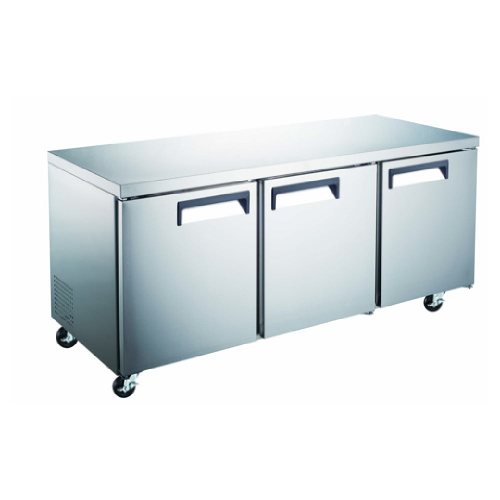 The Admiral Craft GRUCRF-72 Grista Undercounter Refrigerator is a versatile refrigeration solution designed for professional kitchens. This 3-section unit measures 71-1/2"W x 29-1/2"D x 35-1/4"H and boasts a significant 16.9 cu.ft. storage capacity, making it suitable for high-demand environments. Equipped with a rear mount self-contained refrigeration system utilizing R290 refrigerant, this refrigerator maintains a consistent temperature range of 33°F to 41°F, efficiently managed by a digital temperature controller with LED display. The stainless steel worktop provides a durable surface for various kitchen tasks, while the 430 stainless steel exterior ensures long-lasting performance. Inside, the painted aluminum interior houses three adjustable plastic-coated wire shelves, providing flexible storage options. Accessibility is enhanced by three self-closing doors with recessed handles, helping to maintain energy efficiency. The unit is supported by four 4" casters, including two locking and two non-locking, for easy mobility and stability. With a power requirement of 115v/60/1-ph and a 1/5 HP motor drawing 3.2 amps, the GRUCRF-72 is easily integrated into standard kitchen electrical setups. Certified by cETLus and ETL-Sanitation, this refrigerator is a reliable choice for restaurants, catering businesses, and commercial food service operations seeking dependable refrigeration solutions.
