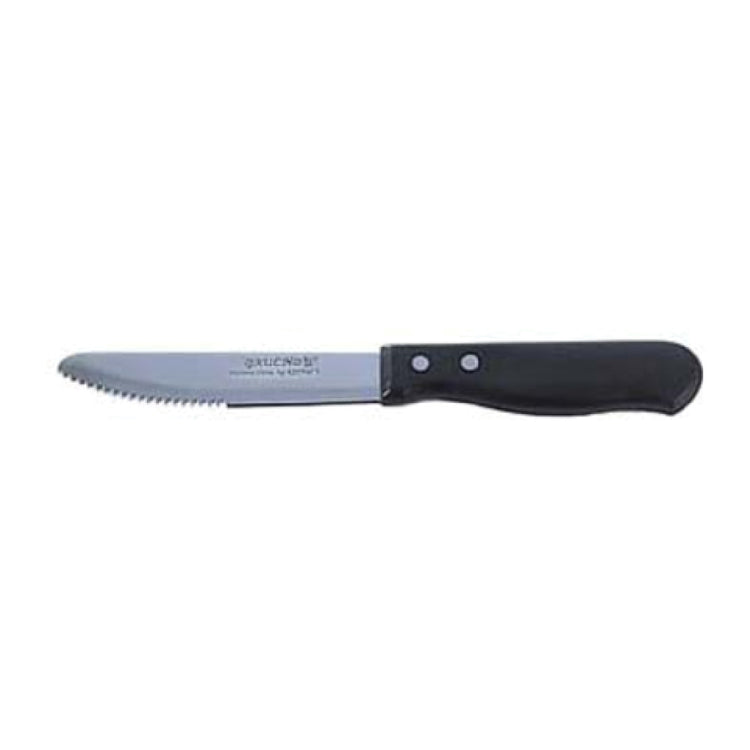 The Admiral Craft GSK-62 Gaucho™ II Steak Knife is a professional-grade kitchen tool, measuring 9-3/4 inches in total length with a prominent 6-inch serrated blade. This knife is specifically designed to excel in the culinary world, making it an essential asset for steakhouses, restaurants, and home kitchens alike. The serrated blade ensures precision cutting, effortlessly slicing through various cuts of meat with ease and efficiency. Its rounded tip provides added safety without compromising functionality. Constructed with a polypropylene handle, the knife is designed for comfort and durability, offering a secure grip that withstands the rigors of daily use. The handle's black color adds a sleek, modern aesthetic, complementing any kitchen decor. The GSK-62 is crafted by Admiral Craft Equipment Corp., a respected name in the industry, known for delivering quality and reliability in kitchenware. This steak knife is an excellent choice for professionals and cooking enthusiasts who value precision and durability in their kitchen tools. Its thoughtful design caters to a diverse range of market segments within the food industry, ensuring a consistent and high-quality performance in various culinary environments.