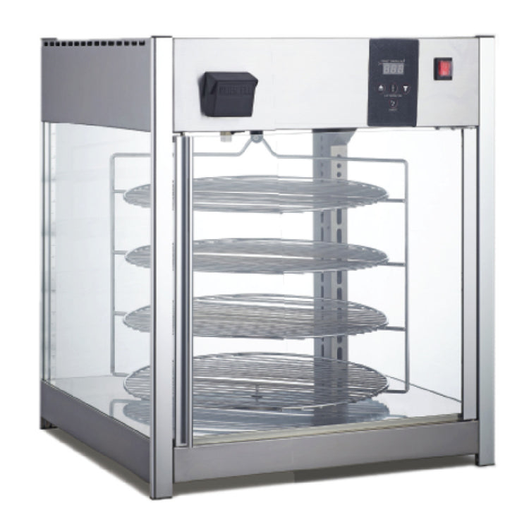 The Admiral Craft HDRP-158 Pizza Display Warmer is a high-performance countertop appliance designed for full-service operations, featuring a 4-tier rotating rack with chrome-plated shelves, capable of holding four 18-inch pizzas. With dimensions of 25-1/4 inches in width, 23-5/8 inches in depth, and 27.6 inches in height, this unit is compact yet efficient, making it suitable for various commercial food service environments. The digital temperature controls and display provide precise adjustments to maintain the optimal heating conditions, while the adjustable temperature and humidity settings ensure that pizzas remain fresh and appetizing. The warmer is equipped with LED interior lighting, enhancing visibility and presentation of the pizzas on display. Operating at 1.7kW with a 115/60/1-ph electrical requirement and drawing 14.2 amps, the HDRP-158 is energy-efficient, suitable for small to medium-sized operations such as pizzerias, cafes, and catering services. The inclusion of a rotating rack not only maximizes storage but also ensures even heat distribution, making it a valuable asset for businesses aiming to maintain high-quality food standards while optimizing space and energy use.