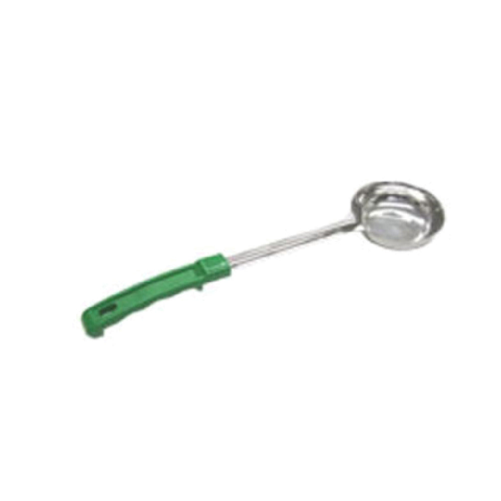 The Admiral Craft LAD-4SO Portion Control Ladle 4 oz. Solid is a meticulously designed kitchen tool that offers precision and durability, essential for food service professionals. This portion control ladle features a solid, one-piece construction, combining a stainless steel bowl with a robust plastic handle that ensures longevity and ease of use. The ladle's 4 oz. capacity is perfectly suited for consistent portioning of soups, sauces, or gravies, making it an invaluable asset in commercial kitchens where uniformity and efficiency are paramount. Its stainless steel composition guarantees resistance to corrosion and stains, maintaining an impeccable appearance and hygiene standards over time. The ergonomic plastic handle not only provides a comfortable grip but is also color-coded in green for easy identification and reduced cross-contamination risks in busy kitchen environments. Admiral Craft's thoughtful design caters to a variety of market segments, from bustling restaurants to institutional dining facilities, offering a reliable solution for portion control in high-volume service settings. With its combination of sturdy materials and user-friendly features, the Admiral Craft LAD-4SO Portion Control Ladle stands out as a durable and practical choice for professionals committed to quality and precision in food service operations.