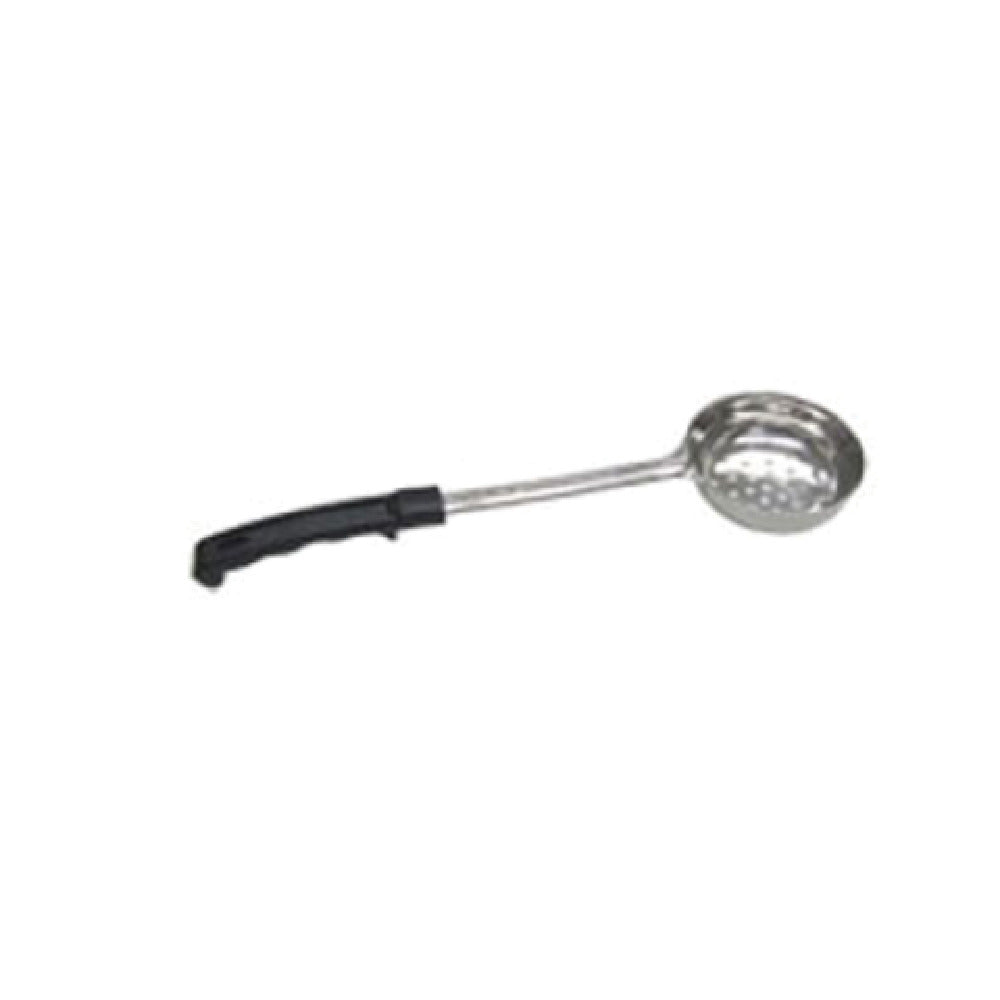 The Admiral Craft LAD-6PE Portion Control Ladle - 6 Oz. Perforated is an essential tool for precise food service operations, expertly designed for portion control. This ladle features a 6 oz. capacity, making it perfect for delivering consistent serving sizes, crucial in maintaining both quality and cost-efficiency in various culinary settings. The one-piece construction enhances durability and ease of cleaning, reducing maintenance time and increasing hygiene standards. The ladle's perforated design is particularly beneficial for straining and serving liquid-based dishes, such as soups and sauces, allowing for efficient liquid drainage while retaining solid foods. The plastic handle offers a comfortable grip and remains cool to the touch, ensuring safety and ease of use during prolonged periods of service. Crafted with stainless steel, the ladle combines robustness with a sleek, modern appearance, suitable for high-volume kitchens and elegant buffet settings alike. Its black handle complements contemporary kitchen aesthetics, making it a versatile addition to any professional foodservice environment. The Admiral Craft LAD-6PE is the ideal choice for restaurants, cafeterias, and catering services that prioritize precision, durability, and style in their kitchen tools.
