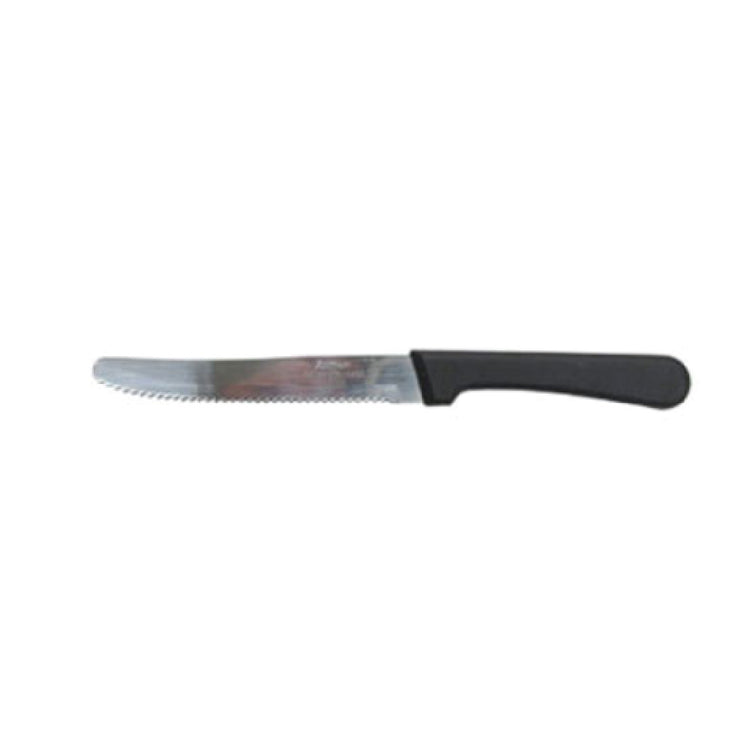The Admiral Craft MS-2000/B Black Steer Deluxe Steak Knife is a precision-crafted utensil designed for both personal and professional culinary settings. Featuring a 4-5/8" serrated blade, this knife is engineered for effortless slicing through steak and other meats, making it a valuable addition to any dining experience. The overall length of the knife is 8-3/4", providing a comfortable grip and exceptional control for the user. Constructed with a hollow ground/grind and a rounded tip, the blade enhances cutting efficiency while ensuring safety. The knife's black polypropylene handle is not only ergonomic but also offers durability and resistance to heat and moisture, making it ideal for high-usage environments. Crafted from stainless steel, the blade promises longevity and sharpness over time, maintaining its function and aesthetic appeal. Sold in packs of 2 dozen, this product is tailored for restaurant businesses, catering services, and home kitchens, offering flexibility and value in bulk purchasing. Its technical specifications combine to deliver a steak knife that balances practicality with style, appealing to diverse market segments within the food service industry. The Admiral Craft MS-2000/B Black Steer Deluxe Steak Knife stands out with its blend of performance and design precision.
