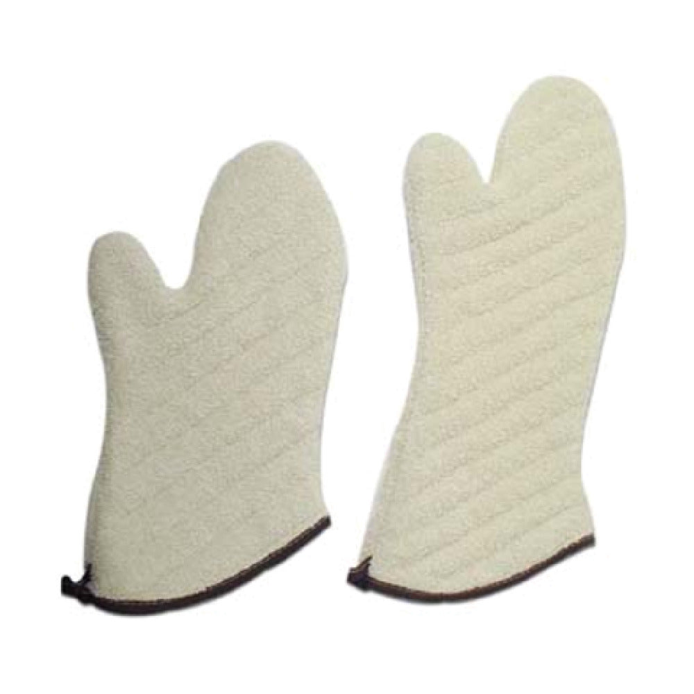 The Admiral Craft MTT-17 Terry Oven Mitt is a robust kitchen essential, expertly designed to provide superior heat protection for a variety of culinary environments. Measuring 17 inches in length, this mitt offers extended coverage, safeguarding hands and forearms from temperatures reaching up to an impressive 600°F. The mitt is quilted with heavy cotton padding, enhancing both its durability and comfort, ensuring a firm and secure grip when handling hot cookware. Its natural color provides a classic and professional aesthetic, suitable for any kitchen. Crafted by Admiral Craft Equipment Corp., this oven mitt is perfect for busy commercial kitchens, bakeries, and catering services where safety and reliability are paramount. The Admiral Craft MTT-17 is also ideal for home chefs who demand professional-grade equipment in their culinary endeavors. Its high-temperature protection and sturdy construction make it a dependable choice for chefs and kitchen staff across the food service industry. This terry oven mitt exemplifies a blend of functionality and safety, making it a valuable addition to any kitchen setting where heat protection is a priority.