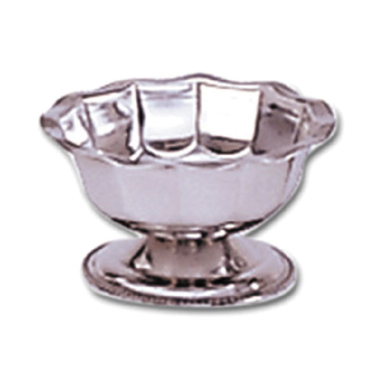 The Admiral Craft SBS-4GB Sherbet Dish is a meticulously designed 4 oz. serving dish, featuring a distinct scalloped rim that adds a touch of elegance to any dessert presentation. Crafted by Admiral Craft Equipment Corp., this dish combines functionality and style, making it suitable for a wide range of dining establishments, from casual eateries to fine dining restaurants. Its paneled body not only enhances its visual appeal but also provides a comfortable grip for servers and patrons alike. The gadroon base further accentuates its classic design, offering stability and enhancing its overall aesthetic. Constructed from high-quality stainless steel, the SBS-4GB Sherbet Dish ensures durability and resistance to corrosion, making it a reliable choice for both indoor and outdoor dining environments. This dish is perfect for serving sherbet, ice cream, or other desserts, providing a versatile option for establishments looking to elevate their dessert presentations. Its size and design make it a practical choice for portion control, helping restaurants manage serving sizes efficiently. Whether used in bustling cafes or upscale dining settings, the Admiral Craft SBS-4GB Sherbet Dish stands out as a sophisticated and functional addition to any table setting.