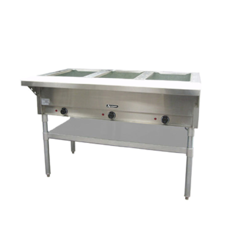 The Admiral Craft ST-120/3 Steam Table is a reliable and versatile solution for commercial kitchens requiring efficient food warming capabilities. This 48-1/2" wide unit features three open wells, each with a depth of 8 inches, catering to a variety of food service needs. Each well is independently controlled by a 750-watt heating element, providing a combined power output of 2250 watts. The infinite control switches offer precise temperature management, essential for maintaining food at optimal serving temperatures. Designed with a robust stainless steel body, galvanized steel wells, and legs, this steam table is built for durability and longevity in demanding kitchen environments. An 8" x 1/2" polycarbonate cutting board provides additional utility for food preparation tasks. The adjustable stainless steel undershelf adds storage flexibility, enhancing kitchen organization. Operating at 125 volts and 60 Hz across three phases, this unit is equipped with a NEMA 5-30P plug and draws 30.0 amps, making it suitable for various commercial settings. Certified for quality and safety with CE marking, the Admiral Craft ST-120/3 Steam Table combines functionality and practicality, making it an essential asset for restaurants, catering services, and hospitality venues that require dependable and efficient food service equipment.