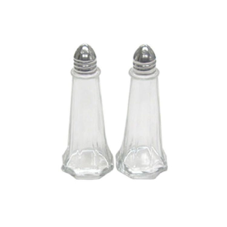 The Admiral Craft TOW-1 Salt/Pepper Shaker is a compact and elegantly designed product, measuring 4-1/4 inches in height and offering a 1 oz. capacity, making it a practical choice for a variety of dining scenarios. Its unique tower style is crafted from high-quality glass, ensuring durability and a clear view of the contents for easy identification. This shaker is accentuated with a chrome-plated metal top, providing a sleek, modern finish that complements any tabletop setting. The combination of glass and chrome not only adds aesthetic appeal but also ensures the shaker remains resistant to wear and tear in high-traffic environments. This product is ideally suited for restaurants, cafes, and catering services that require reliable and stylish condiment dispensers. Additionally, its size and design make it an attractive option for home use, offering both functionality and a touch of elegance to personal dining experiences. The Admiral Craft TOW-1 Salt/Pepper Shaker stands out for its blend of form and function, making it a valuable addition to any culinary setting where quality and presentation are paramount.