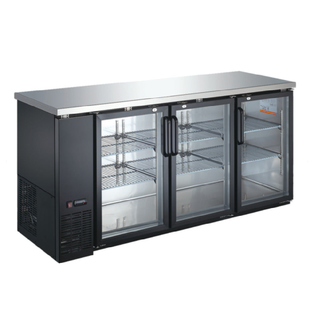 The Admiral Craft USBB-7224G U-STAR Back Bar Bottle Cooler is a versatile refrigeration solution, ideal for various establishments such as bars, restaurants, and event venues. This cooler features dimensions of 72 inches in width and 24-1/2 inches in depth, with a spacious 20 cubic feet capacity, making it suitable for accommodating diverse beverage storage needs. Constructed with a robust 304 stainless steel countertop and interior, and a black-coated steel exterior, it ensures durability and a sleek appearance. The cooler is equipped with three hinged glass doors, each with a lock for secure storage. Its interior is illuminated by LED lighting, enhancing visibility and access. With a side mount self-contained refrigeration system, this unit supports efficient temperature management and includes an automatic defrosting function. It houses six adjustable plastic-coated wire shelves and can hold up to three half-barrel kegs, or 84 six-packs of 12 oz. cans, or 100 six-packs of 12 oz. bottles. Operating on R290 refrigerant, the cooler runs on a 115v/60/1-ph electrical setup with a 1/4 HP compressor and comes with a 7-foot cord, featuring a NEMA 5-15P plug. Certified by cETLus and ETL-Sanitation, it meets high standards of safety and hygiene.