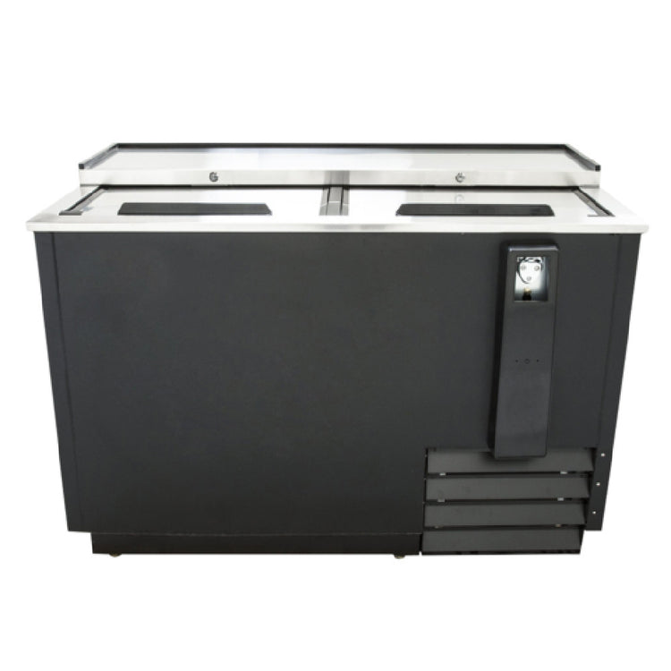 The Admiral Craft USBC-50 U-STAR Bottle Cooler Flat Top 50"W is a premium refrigeration solution designed for commercial environments, providing efficient bottle cooling with an ample 14 cu.ft. capacity. This unit boasts a flat top design measuring 50 inches in width, accommodating various storage needs. Its robust construction includes two lockable stainless steel sliding lids, ensuring secure storage and easy access. Inside, three plastic-coated steel dividers facilitate organized storage of beverages. The side mount self-contained refrigeration system utilizes R290 refrigerant, ensuring energy-efficient operation, and features automatic defrosting to minimize maintenance efforts. A built-in bottle opener with a cap catcher adds convenience, making it ideal for high-traffic bars and restaurants. The interior is lined with painted aluminum for durability, while the exterior is constructed from black-coated steel, providing a sleek and professional appearance. The unit operates on a 115v/60/1-ph electrical connection, drawing 2.28 amps, and is powered by a 1/6 HP motor. It comes with a 7-foot cord and is equipped with a NEMA 5-15P plug. Safety and sanitation are assured with cETLus and ETL-Sanitation certifications, making this bottle cooler a reliable choice for any beverage service operation.