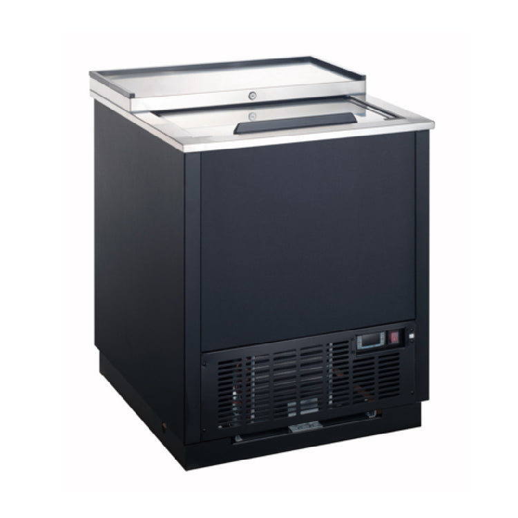 The Admiral Craft USGF-1L U-STAR Glass Froster is a compact and efficient solution for maintaining the perfect chill for your glassware, with an overall size of 26-1/2"W x 26-3/4"D x 34-1/4"H. It features a generous 4 cu.ft. capacity, accommodating up to 90 mugs measuring 8 inches each or 85 steins at 10 oz. each, making it an ideal choice for bars and restaurants with high demand for chilled beverages. The froster is equipped with advanced electronic temperature controls, ensuring precise cooling performance. The unit includes a single sliding solid lid that provides easy access to its contents, while the coated steel adjustable dividers allow for flexible organization within the froster. The interior is constructed from durable coated aluminum, and the exterior boasts a sleek black vinyl finish, complemented by a sturdy stainless steel top. The froster operates on a R290 refrigerant and is powered by a 1/5 HP motor, running on a 115v/60/1-ph electrical setup, drawing 1.07 amps. It is fitted with a NEMA 5-15P plug. Certified by cETLus and ETL-Sanitation, this glass froster is built to meet stringent safety and sanitation standards, making it a reliable addition to any commercial setting.