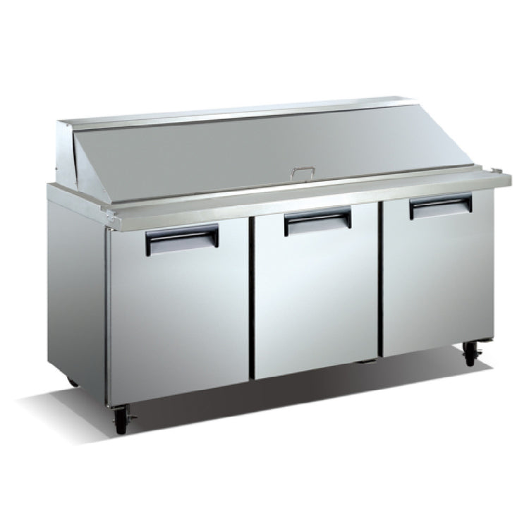 The Admiral Craft USSLM-3D U-STAR Mega Top Salad/Sandwich Refrigerated Prep Table 72"W is a versatile and robust option for commercial kitchens requiring efficient prep and storage solutions. With a spacious 18 cu.ft. capacity spread across three sections, this prep table provides ample space for an array of ingredients. The rear-mounted self-contained refrigeration system ensures consistent cooling, while the digital temperature controller with LED display offers precise temperature management. Automatic defrosting maintains optimum functionality with minimal intervention. The table is equipped with three doors featuring recessed handles, insulated hinged lids, and a removable door gasket for added convenience and energy efficiency. Inside, three plastic-coated wire shelves and a 3/4" thick removable polyethylene cutting board facilitate organized and efficient food preparation. Including thirty 1/6 pans, the unit is constructed with a durable 430 stainless steel exterior and a 304 stainless steel interior, ensuring lasting durability and easy cleaning. The prep table rests on four 6" casters for mobility, powered by an 8.4 amp, 3/4 HP motor, with a 7' cord and a NEMA 5-15P plug for easy installation. Certified by cETLus, this refrigerator is a reliable choice for restaurants, cafes, and other foodservice establishments.
