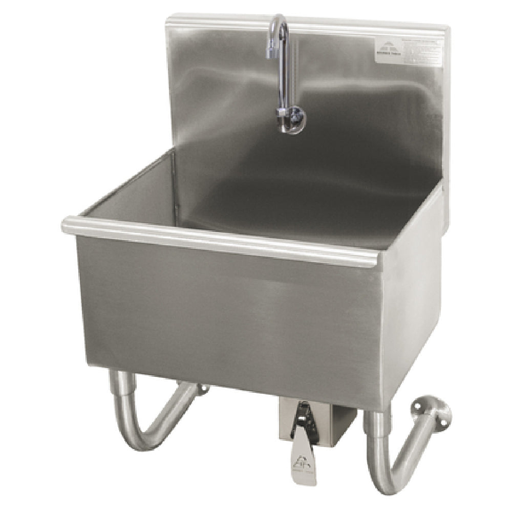 The Advance Tabco 19-18-23KV Multiwash Hand Sink Wall Mounted With Knee Valve is engineered for efficient and hygienic handwashing in various industry settings such as food service, healthcare, and hospitality. Its wall-mounted design measures 23 inches wide, 19-1/2 inches deep, and 28-1/2 inches high overall, ensuring that it fits seamlessly into different spaces. The bowl itself is designed with a 16-inch front-to-back size and an 8-inch depth, providing ample space for washing tasks. An 8-1/2 inch high backsplash is included to protect walls from water splashes, and it's punched with a single faucet hole to accommodate various faucet needs. The gooseneck spouts enhance user convenience, while the basket drain ensures efficient water drainage. Constructed from 16 gauge 304 stainless steel, this sink offers durability and a long lifespan, essential for high-use environments. Tubular stainless steel wall supports provide additional stability, ensuring the sink remains secure once installed. The knee valve operation promotes hands-free use, enhancing sanitary conditions, which is particularly valuable in environments requiring stringent hygiene standards. This product is ideal for industries where cleanliness is paramount and space efficiency is a concern, providing a practical and robust solution for professional settings.