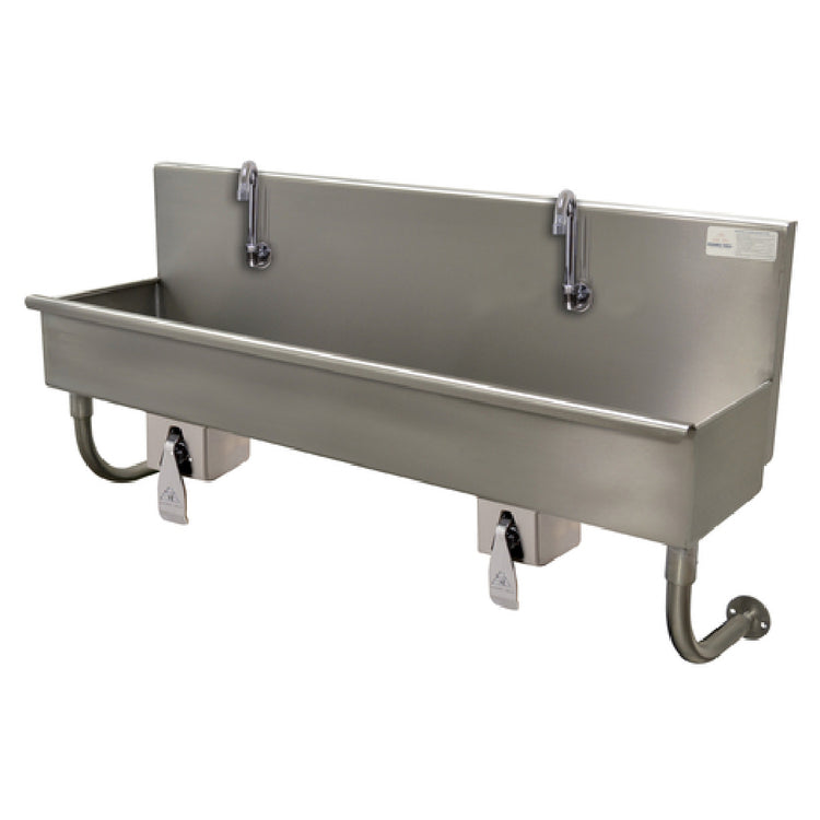 Advance Tabco, 19-18-48KV, Multiwash Hand Sink, wall mounted, with knee valve, 48"W x 19-1/2"D x 28-1/2"H (overall), 16" front-to-back x 8" deep (bowl size), 8-1/2"H backsplash, punched with (2) single faucet holes, gooseneck spouts, includes basket drain, 16 gauge 304 stainless steel construction, tubular stainless steel wall supports