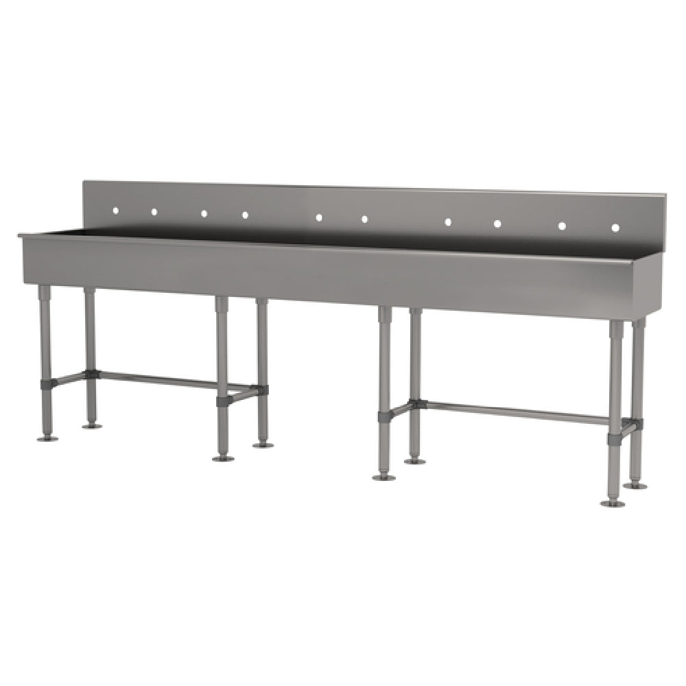 The Advance Tabco 19-FM-100-F Multiwash Hand Sink stands out with its impressive technical specifications, catering to diverse market segments within the industry. This robust unit measures 100 inches in width, 19-1/2 inches in depth, and 42-1/2 inches in height, making it a space-efficient solution for high-demand environments. The sink features a bowl size of 16 inches front-to-back and 8 inches deep, ensuring ample washing space for various tasks. Constructed from 16 gauge 304 stainless steel, it guarantees durability and longevity, essential for rigorous daily use. Five separate faucets accommodate multiple users simultaneously, enhancing efficiency in busy settings. The 8-1/2-inch high backsplash and punched (5) sets of faucet holes spaced 8 inches on center offer flexibility and ease of installation. The inclusion of a 3-1/2-inch rear basket drain facilitates effective water management, maintaining cleanliness and hygiene standards. Designed with stainless steel legs and flanged feet, the sink ensures stability and resilience on different surfaces. The Advance Tabco 19-FM-100-F Multiwash Hand Sink is a versatile asset for commercial kitchens, healthcare facilities, and laboratories, emphasizing its superior design and construction tailored to meet the demands of various professional environments.