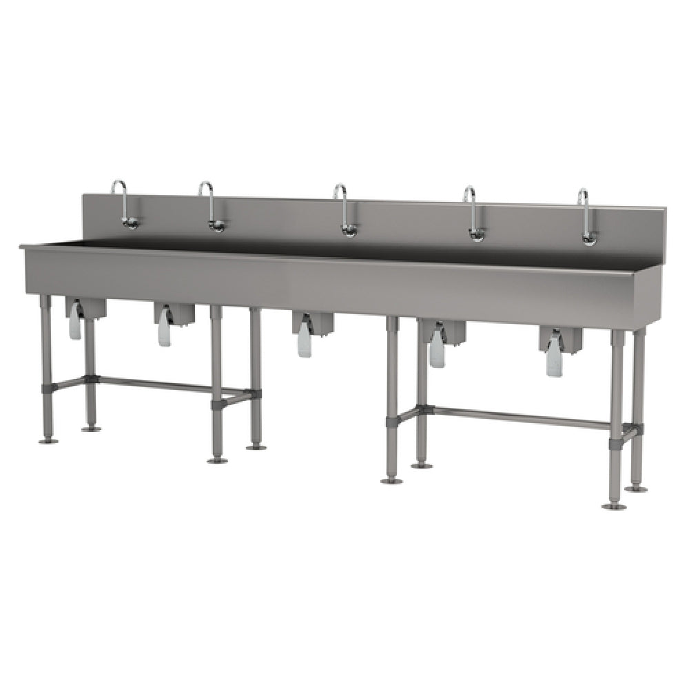 The Advance Tabco 19-FM-100KV Multiwash Hand Sink with Stainless Steel Legs and Flanged Feet is a meticulously engineered unit tailored for versatile applications across different market segments in the industry. Measuring 100"W x 19-1/2"D x 42-1/2"H overall, this hand sink is designed for efficient multi-use functionality. The sink features a bowl size of 16" front-to-back x 8" deep, providing ample space for handwashing needs. With an 8-1/2"H backsplash, it effectively prevents water splashes on surrounding surfaces, ensuring cleanliness and hygiene. The sink is punctuated with five single faucet holes and comes with gooseneck spouts, offering flexibility in water flow management. The inclusion of a knee valve facilitates hands-free operation, enhancing convenience and hygiene. Constructed from 16-gauge 304 stainless steel, the unit promises durability and resistance to corrosion, making it ideal for high-traffic environments. The stainless steel legs with flanged feet provide robust stability, while the included basket drain ensures effective water drainage. This product stands out for its practical design and durable construction, catering to the needs of commercial kitchens, healthcare facilities, and other professional settings where efficient and sanitary handwashing solutions are paramount.