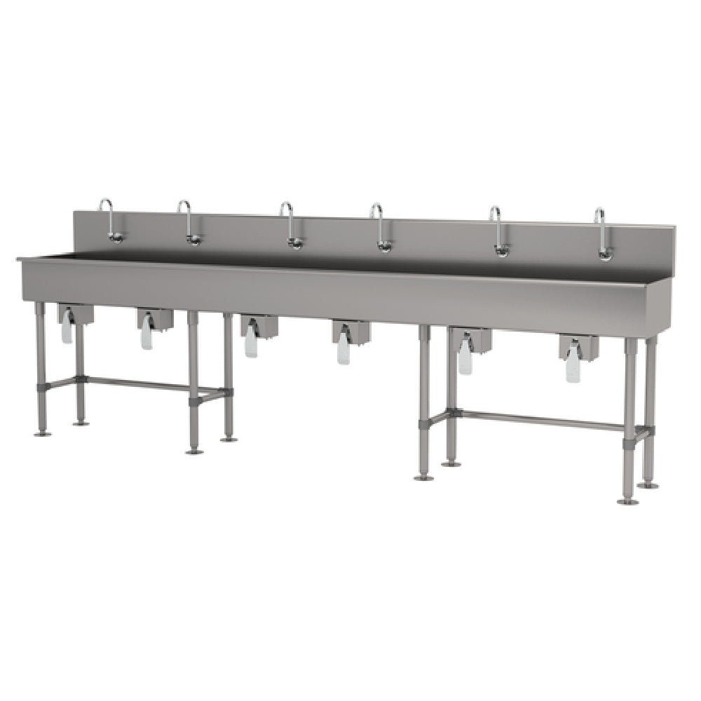 The Advance Tabco 19-FM-120KV Multiwash Hand Sink is a meticulously designed unit, boasting a comprehensive array of features tailored for various professional environments. Its dimensions stand at an impressive 120 inches in width, 19-1/2 inches in depth, and 42-1/2 inches in height overall, providing ample space and convenience for users. The sink's bowl measures 16 inches front-to-back and 8 inches deep, ensuring a substantial washing area to accommodate multiple tasks. An 8-1/2 inch high backsplash complements the unit, effectively managing water splashes and maintaining cleanliness. Constructed from durable 16 gauge 304 stainless steel, the sink is built to withstand rigorous use while maintaining a sleek appearance. With stainless steel legs and flanged feet, stability and durability are assured in high-traffic areas. The inclusion of a knee valve enhances hygiene by allowing hands-free operation, a crucial feature in medical, food service, and industrial settings. The sink is perforated with six single faucet holes, and paired with gooseneck spouts and a basket drain, it ensures efficient water management. This robust construction makes the Advance Tabco 19-FM-120KV Multiwash Hand Sink an invaluable asset to any facility requiring high standards of cleanliness and functionality.