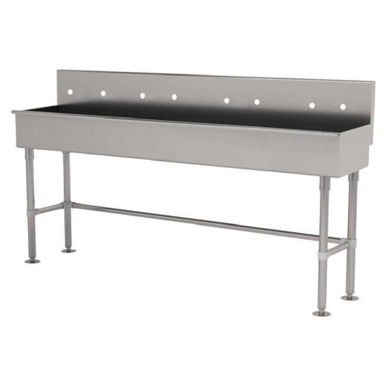 Advance Tabco, 19-FM-96-F, Multiwash Hand Sink, with stainless steel legs and flanged feet, includes (4) faucets, 96"W x 19-1/2"D x 42-1/2"H (overall), 16" front-to-back x 8" deep (bowl size), 8-1/2"H backsplash, punched with (4) sets of faucet holes 8" OC, includes 3-1/2" rear basket drain, 16 gauge 304 stainless steel construction