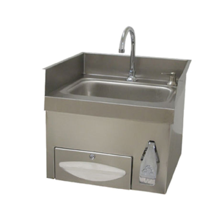 The Advance Tabco 7-PS-43 Recessed Hand Sink is a versatile and durable sanitation solution designed for various industry sectors requiring reliable handwashing facilities. With a compact sink bowl measuring 14"W x 10"D x 5" deep, this unit fits seamlessly into tight spaces, ensuring efficient use of room without sacrificing functionality. It is equipped with a heavy-duty knee-operated gooseneck faucet, enhancing hygiene by allowing hands-free operation, which is particularly valuable in healthcare, food service, and laboratory settings. Constructed from 304 stainless steel, the sink offers excellent durability and resistance to corrosion, ensuring long-lasting performance. The inclusion of 4"H side splashes minimizes water spillage and maintains a clean surrounding area. This unit also features built-in soap and paper towel dispensers, streamlining the handwashing process. The product's NSF certification emphasizes its compliance with stringent public health standards, making it a reliable choice for environments where hygiene is paramount. The recommended countertop opening should not exceed dimensions of 17-1/4" front to back and 17-3/8" left to right, ensuring a snug fit in installation. The Advance Tabco 7-PS-43 is designed to meet the demands of varied professional environments by combining space efficiency with essential hygienic features.