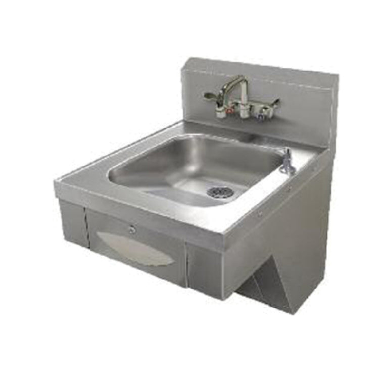 The Advance Tabco 7-PS-46 ADA Compliant Hand Sink is specifically engineered for environments demanding high compliance and efficiency. This wall-mounted sink features a tapered bowl design, measuring 14 inches wide by 16 inches front-to-back with a 5-inch depth, maximizing usability in compact spaces. Crafted from durable 18 gauge 304 stainless steel, it is built for longevity and resistance to corrosion. The inclusion of a heavy-duty splash mount faucet with wrist handles complements the sink's practical design, ensuring ease of use and hygiene. An integral deck-mounted soap dispenser (pump) and an undermounted, front-loading paper towel dispenser add convenience and accessibility. The stainless steel skirt with a removable access panel and enclosed bottom enhances both the aesthetic and functional aspects of this unit. It also comes equipped with a drain featuring a crumb basket, facilitating easy maintenance. The Advance Tabco 7-PS-46 is supplied with wall brackets for secure installation. Compliant with NSF and cCSAus standards, this hand sink is tailored for diverse markets, including healthcare and foodservice industries, where ADA compliance and space optimization are paramount. Its thoughtful design elements make it a versatile and essential component in maintaining sanitary standards.