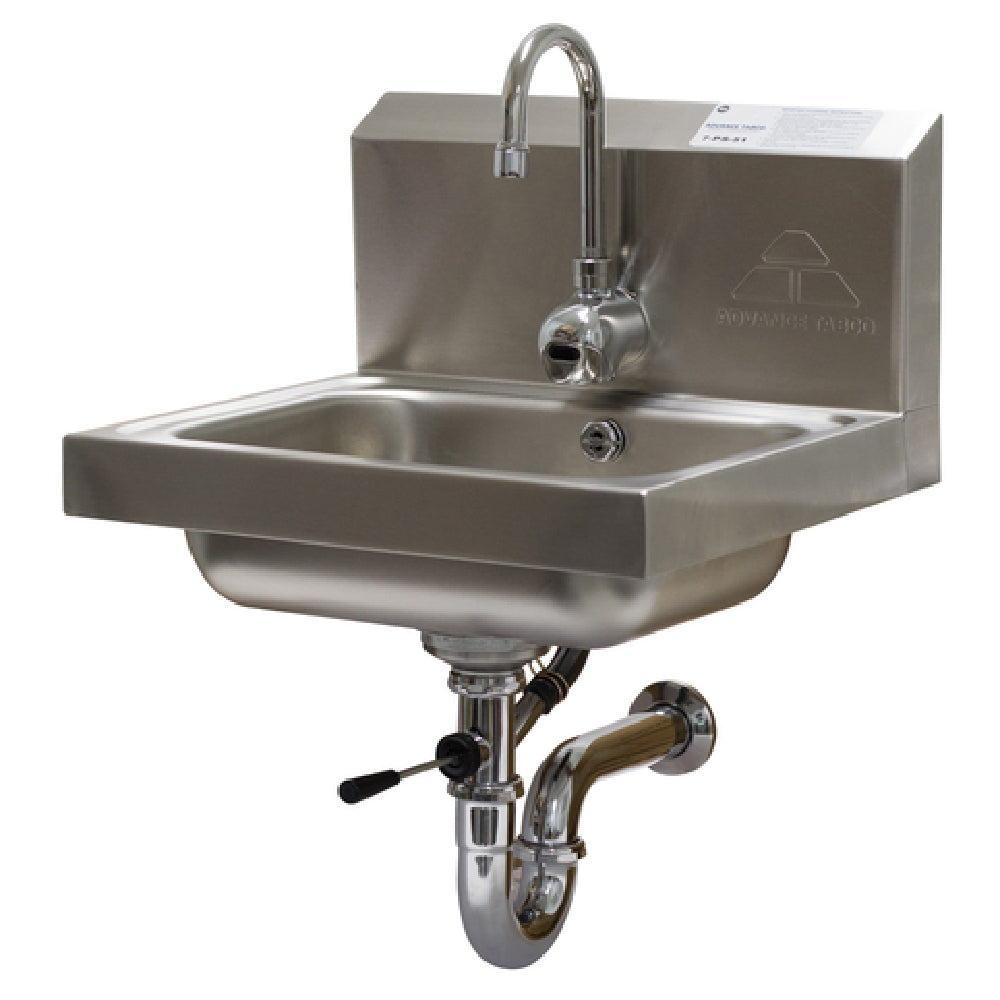 Advance Tabco 7-PS-51 Hand Sink Wall Mounted 14" Wide X 10" Front-to-back X 5" Deep Bowl is a meticulously engineered solution for commercial environments requiring compact and efficient handwashing facilities. This hand sink is crafted from 20 gauge 304 stainless steel, known for its durability and resistance to corrosion, ensuring longevity and ease of maintenance. Designed for wall mounting, it conserves valuable floor space, making it ideal for busy kitchens and workspaces. The sink's bowl dimensions of 14 inches in width, 10 inches front-to-back, and 5 inches deep provide ample space for effective handwashing. It features a sophisticated electronic faucet compatible with both battery and 110v power options, catering to various installation needs and enhancing user convenience. The inclusion of a lever drain with an overflow ensures efficient water drainage, while the P-trap is included for secure plumbing connections. A sturdy wall bracket facilitates easy and firm installation. This hand sink is NSF certified, ensuring it meets rigorous public health and safety standards, and it carries the cCSAus certification, attesting to its compliance with Canadian and U.S. safety requirements. Ideal for diverse industry segments, this hand sink combines functionality with a compact design.