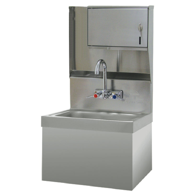 The Advance Tabco 7-PS-727 Hand Sink Class 1 Upgrade Security Unit is a versatile and robust solution tailored for environments requiring stringent hygiene standards and enhanced security. This wall-mounted unit features a compact design with dimensions of 14 inches in width, 10 inches front-to-back, and a 5-inch deep bowl, making it an excellent fit for space-conscious installations. Constructed from 304 stainless steel, it promises durability and resistance to corrosion, maintaining its sleek appearance over time. The sink is equipped with a heavy-duty splash-mounted gooseneck faucet, ensuring ease of use and minimizing water splashes. A concealed drain system enhances the unit's clean and seamless look, while the integrated towel dispenser and provisions for a soap dispenser offer added convenience and promote hygiene. Certified by NSF and cCSAus, this hand sink meets rigorous standards for public health and safety, assuring users of its quality and reliability. Ideal for institutions, healthcare facilities, or any secure setting, the Advance Tabco 7-PS-727 Hand Sink provides a practical and efficient solution for maintaining cleanliness in various professional environments.