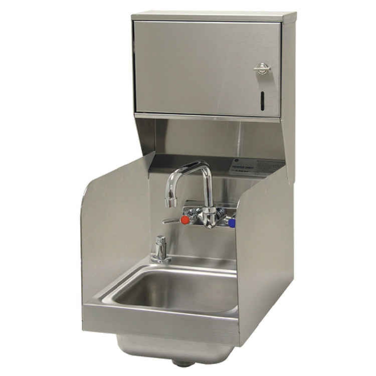The Advance Tabco 7-PS-73 Hand Sink is a wall-mounted unit designed to maintain hygiene standards in commercial environments. Featuring left and right side splashes, this hand sink is engineered to prevent water spillage and maintain a clean workspace. The sink bowl measures 9 inches wide, 9 inches front-to-back, and 5 inches deep, providing an efficient and compact design ideal for limited spaces. Constructed from 20-gauge 304 stainless steel, it guarantees durability and resistance to corrosion, making it suitable for heavy-duty use. The unit includes a splash-mounted faucet and an integrated towel dispenser for convenience. For added functionality, it comes with a deck-mounted soap dispenser and a drain equipped with a crumb basket, ensuring easy maintenance and cleanliness. The 1-1/2 inch IPS connection facilitates straightforward installation. Certified by NSF and cCSAus, this hand sink meets stringent health and safety standards. This product is a perfect choice for restaurants, healthcare facilities, and industrial kitchens, offering a reliable and practical solution for maintaining cleanliness and efficiency in high-demand settings.