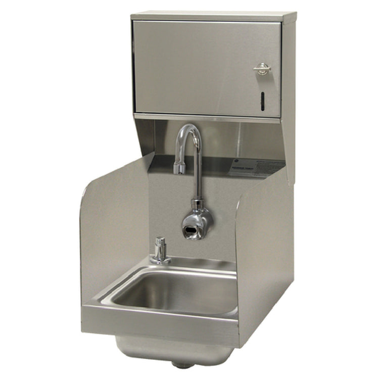 The Advance Tabco 7-PS-89 Hand Sink Wall Mounted With Left & Right Side Splashes is a compact and efficient solution for maintaining hygiene in various professional environments. This hand sink features a 9-inch wide x 9-inch front-to-back x 5-inch deep bowl, crafted from durable 20-gauge 304 stainless steel, ensuring long-lasting performance and resistance to corrosion. Equipped with an electronic faucet, this unit provides a touchless experience, enhancing sanitation standards. The inclusion of left and right side splashes minimizes water spillage, maintaining cleanliness in the surrounding area. The hand sink also comes with a deck-mounted soap dispenser and a convenient towel dispenser, offering a fully integrated handwashing station. Its drain is fitted with a crumb basket and a 1-1/2 inch IPS connection, facilitating efficient water drainage. Certified by both NSF and cCSAus, this product meets stringent public health, safety, and environmental standards, making it a reliable choice for a range of industries, including healthcare, food service, and manufacturing. The Advance Tabco 7-PS-89 combines thoughtful design with practical features, making it an essential asset in settings that value hygiene and efficiency.