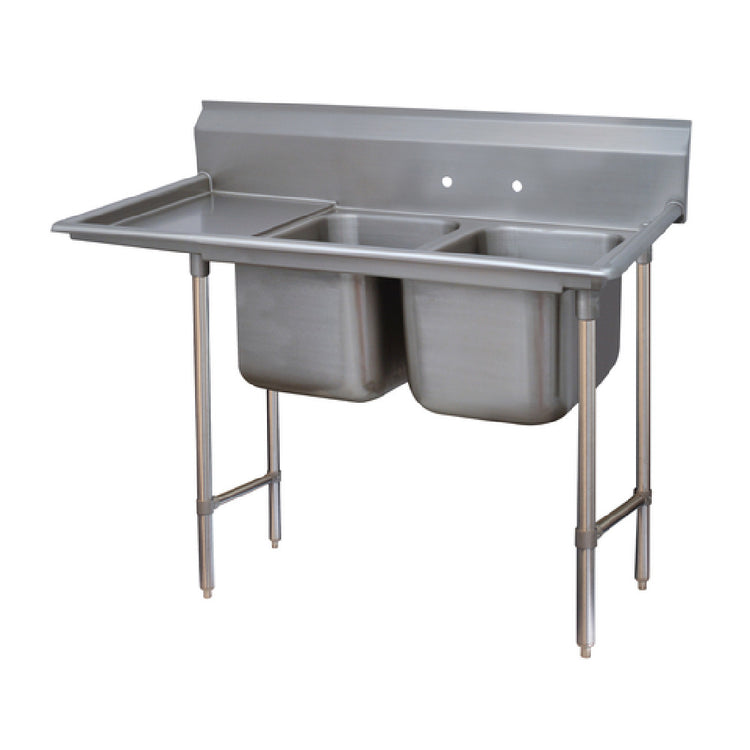 The Advance Tabco 93-42-48-36L Regaline Sink is a high-quality, 2-compartment unit featuring a left-hand drainboard, making it a versatile choice for commercial kitchens seeking efficiency and durability. Each sink compartment measures 24 inches front-to-back by 24 inches wide, offering ample space for washing and rinsing tasks, while the compartments are 12 inches deep to accommodate larger cookware. An 8-inch high backsplash is integrated to protect walls from splashes and maintain a clean environment. Constructed from robust 16-gauge 304 stainless steel, this sink promises longevity and resistance to corrosion, essential for enduring heavy-duty use. Its stainless steel open frame base with side crossrails provides stability, while the 1-inch adjustable bullet feet ensure a level setup on uneven floors. The 36-inch drainboard adds functionality, offering additional space for drying dishes and utensils. Overall dimensions of 32 inches front-to-back by 93 inches left-to-right make this sink a substantial addition to any food service operation. Certified by NSF, it meets rigorous public health standards, making it ideal for various industry segments, from restaurants to catering businesses, that prioritize hygiene and reliability.