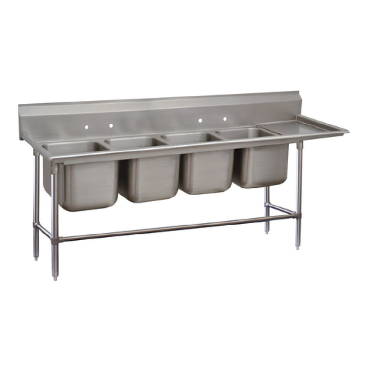 The Advance Tabco 94-4-72-24R Regaline Sink 4-compartment with Right-hand Drainboard is an industry-standard sink solution designed for efficient workflow in commercial kitchens. Featuring four spacious sink compartments measuring 20 inches front-to-back by 16 inches wide and 14 inches deep, this sink supports high-volume and versatile cleaning tasks. The unit is equipped with a convenient 24-inch right-hand drainboard that enhances workflow efficiency. Built with durability in mind, it boasts 14 gauge 304 stainless steel construction, offering resistance to rust and corrosion, essential in maintaining hygiene standards. This robust design includes a practical 11-inch high backsplash, preventing water spillage and facilitating easy cleaning. Supporting its sturdy build are stainless steel legs with adjustable left-to-right and front cross rails, ensuring a stable and customizable fit in various kitchen layouts. The sink's 1-inch adjustable bullet feet accommodate uneven floors, providing additional stability. With an overall size of 28 inches front-to-back by 102 inches left-to-right, it is well-suited for spacious kitchen environments. NSF certification underscores its compliance with public health and safety standards, making it a reliable choice for commercial kitchens requiring efficiency and durability. Note that the sink requires two faucets for full operation, which are not included.
