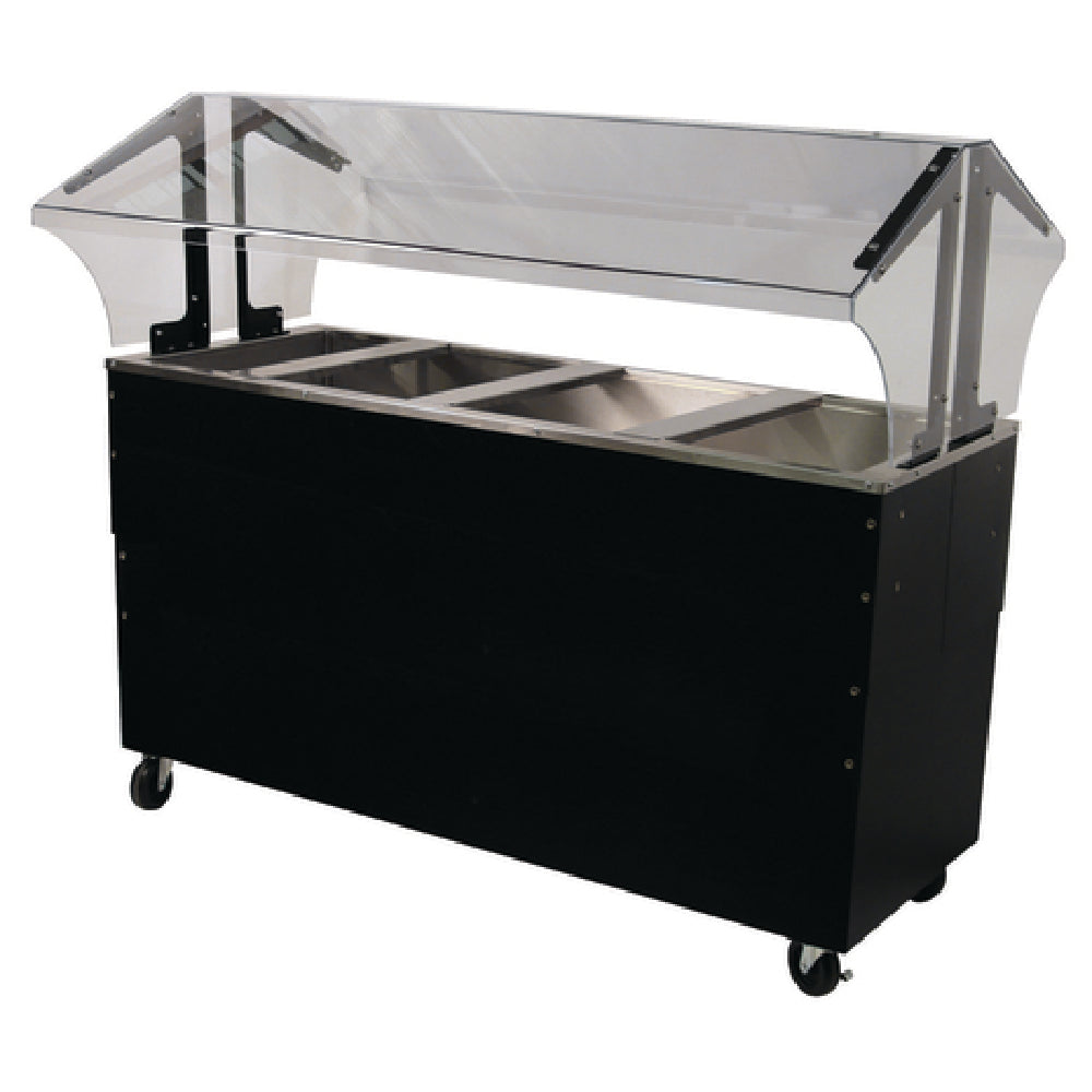 The Advance Tabco B4-CPU-B-SB Ice Cooled Portable Food Buffet Table is a versatile piece of equipment designed for efficient food service operations. With dimensions of 62-7/16"W x 35"D x 53"H, it features a double-sided sneeze guard for enhanced hygiene, making it ideal for catering services and buffet-style dining. This portable buffet table can accommodate four 12" x 20" pan inserts, with a depth capacity of up to 6-1/4" each, and includes additional space below for ice to maintain food temperature. The 8" deep well, equipped with a 1" IPS drain, allows for convenient water drainage and easy clean-up. Its enclosed base and black vinyl clad finish add to its durability and aesthetic appeal. Equipped with four 5" swivel casters, two of which have brakes, this buffet table is easily maneuverable and can be securely stationed during service. The NSF certification ensures it meets public health and safety standards, making it suitable for various applications, including restaurant buffets, wedding receptions, and corporate events. The Advance Tabco B4-CPU-B-SB is an essential asset for any establishment seeking reliable, mobile, and efficient food presentation solutions.