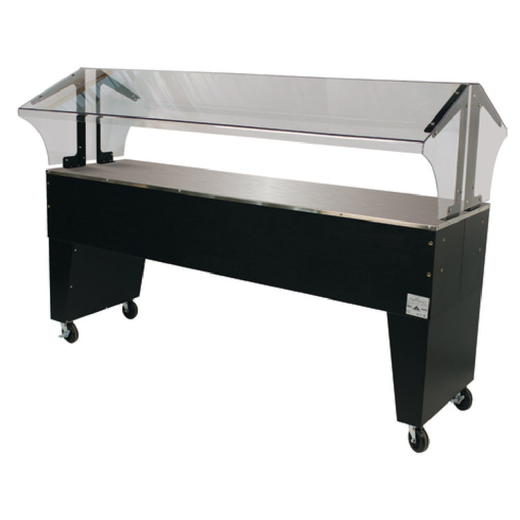 The Advance Tabco B5-STU-B Portable Solid Top Buffet Table is a meticulously designed piece of equipment tailored for efficient food service. This 77-3/4"W x 35"D x 53"H buffet table features a solid top constructed from 20 gauge stainless steel, ensuring durability and longevity in high-traffic environments. Its design includes a double-sided sneeze guard, providing added protection and hygiene for food displays, crucial for establishments prioritizing health and safety. The table accommodates up to five pan sizes, offering versatility in food presentation and serving. It is supported by a black vinyl-clad open base, which not only adds to the aesthetic appeal but also allows for easy access and storage underneath. Equipped with 4" swivel casters, including two that are braked, this buffet table ensures mobility and stability, making it an adaptable solution in various settings, from catering events to hotel buffets. The NSF certification underscores its compliance with public health standards, making it a reliable asset for any food service operation prioritizing safety and sanitation. Combining functionality with a sleek design, the Advance Tabco B5-STU-B is an invaluable addition for professionals seeking to enhance their food service experience.