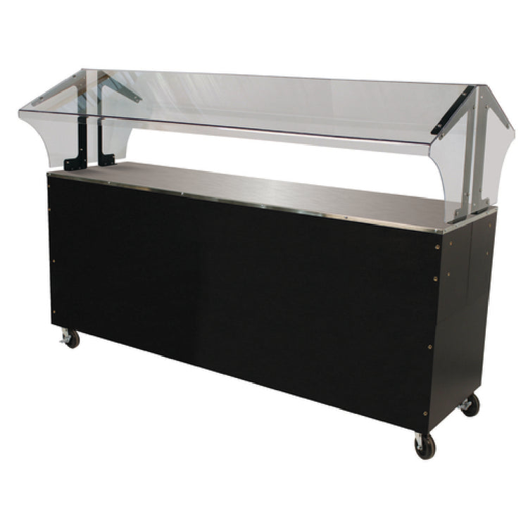 The Advance Tabco B5-STU-B-SB Portable Solid Top Buffet Table is a versatile unit designed to accommodate diverse catering and food service environments. Measuring 77-3/4 inches in width, 35 inches in depth, and 53 inches in height, it provides ample space for presentation and service. The table features a solid top constructed from 20-gauge stainless steel, ensuring durability and easy maintenance. It is engineered to hold up to five pans, making it suitable for serving a variety of dishes simultaneously. A double-sided sneeze guard offers enhanced hygiene, protecting food from contamination while allowing access from both sides. The table's base is enclosed with black vinyl cladding, offering a sleek appearance and additional protection. For ease of mobility, the unit is equipped with 4-inch swivel casters, with two of them featuring brakes for stability during use. This buffet table is NSF certified, highlighting its compliance with stringent public health standards. These features collectively make the Advance Tabco B5-STU-B-SB Portable Solid Top Buffet Table an ideal choice for establishments seeking a reliable, mobile, and hygienic solution for buffet-style presentations.