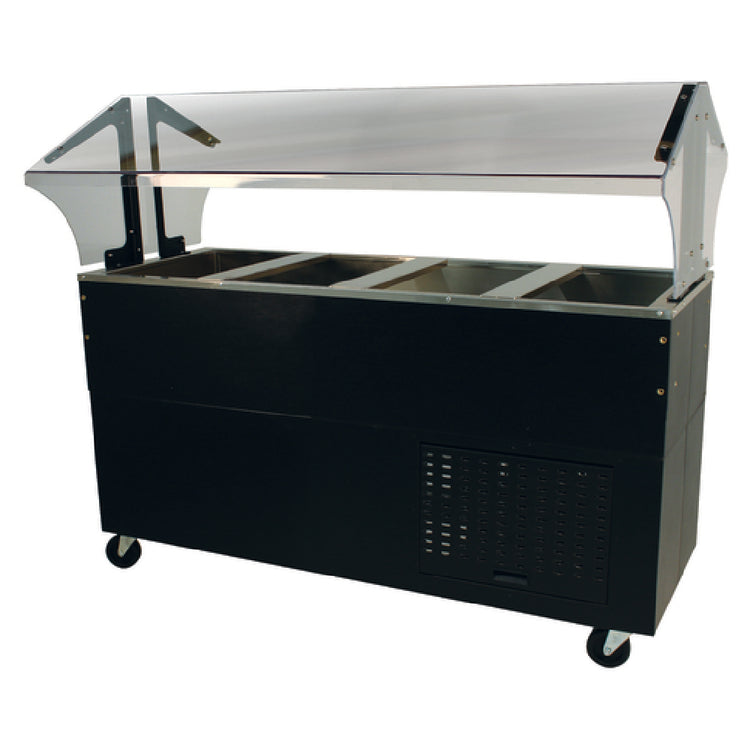 The Advance Tabco BMACP4-B-SB Serving Counter with Mechanically Assisted Cold Pan is a specialized unit designed for efficient food service operations, featuring a double-sided sneeze guard for added safety. With dimensions of 62-7/16"W x 35"D x 53"H, it accommodates four 12" x 20" pans with a depth of up to 6-1/4", making it suitable for versatile food storage. The unit's design includes additional space below for cold air circulation, supported by a digital programmable thermostat and expansion valve for precise temperature control. Crafted with a stainless steel top and a black vinyl-clad exterior, it ensures durability and ease of cleaning. The serving counter is equipped with a self-contained refrigeration system and features 1" I.P.S drains for efficient water management. Mobility is enhanced by four 4" swivel casters, two of which have brakes for stability. This ETLus-listed unit seamlessly integrates into various food service environments, providing a reliable solution for maintaining food freshness and safety.