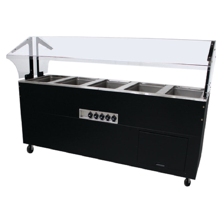 The Advance Tabco BSW5-240-B-SB Portable Hot Food Buffet Table is a versatile electric unit designed to accommodate diverse culinary needs with its stainless steel top and sturdy matte black vinyl steel clad body. This buffet table features five 12" x 20" hot food wells, each capable of holding pan inserts up to 6-1/4" deep, making it ideal for various food service applications. The unit's sealed wells are equipped with manifold drains for efficient operation. It offers precise temperature control with infinite controls and includes fiberglass insulation between wells to maintain consistent heat distribution. Safety and hygiene are enhanced with the inclusion of a food shield, comprising a thermoplastic top and acrylic end panels that serve as a sneeze guard. The solid base and removable front panel provide structural integrity and ease of access, while the 4" swivel casters, two of which have brakes, allow for mobility and stability in any setting. This buffet table operates at 208-240 volts, ensuring powerful performance for commercial environments. Certified by NSF and UL, the Advance Tabco BSW5-240-B-SB is a practical solution for restaurants, catering businesses, and food service establishments looking for reliability and efficiency in food presentation and serving.