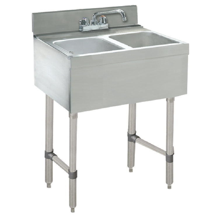 The Advance Tabco CRB-22C Underbar Basics™ Sink Unit is expertly designed for efficiency and durability with its 2-compartment configuration, measuring 24"W x 21"D x 33"H overall. This unit features two 10"W x 14"D x 10" deep sink bowls equipped with an overflow pipe, offering ample space for washing and sanitation tasks in commercial settings. A 4"H backsplash prevents water spills, enhancing cleanliness and ease of maintenance. The unit includes a deck-mounted faucet with a 6" spout, providing a steady and convenient water flow. Constructed from stainless steel with a galvanneal understructure, the sink ensures robust longevity and resistance to corrosion, ideal for high-traffic environments such as bars, cafes, and restaurants. Its galvanized legs, complete with front-to-back cross rails and adjustable bullet feet, provide stable support and customizable height adjustment to fit various workspace needs. NSF certification guarantees compliance with stringent public health standards, ensuring safe and sanitary operation. This sink unit's compact size and efficient design make it a versatile choice for establishments seeking reliable and space-saving solutions for their underbar operations.