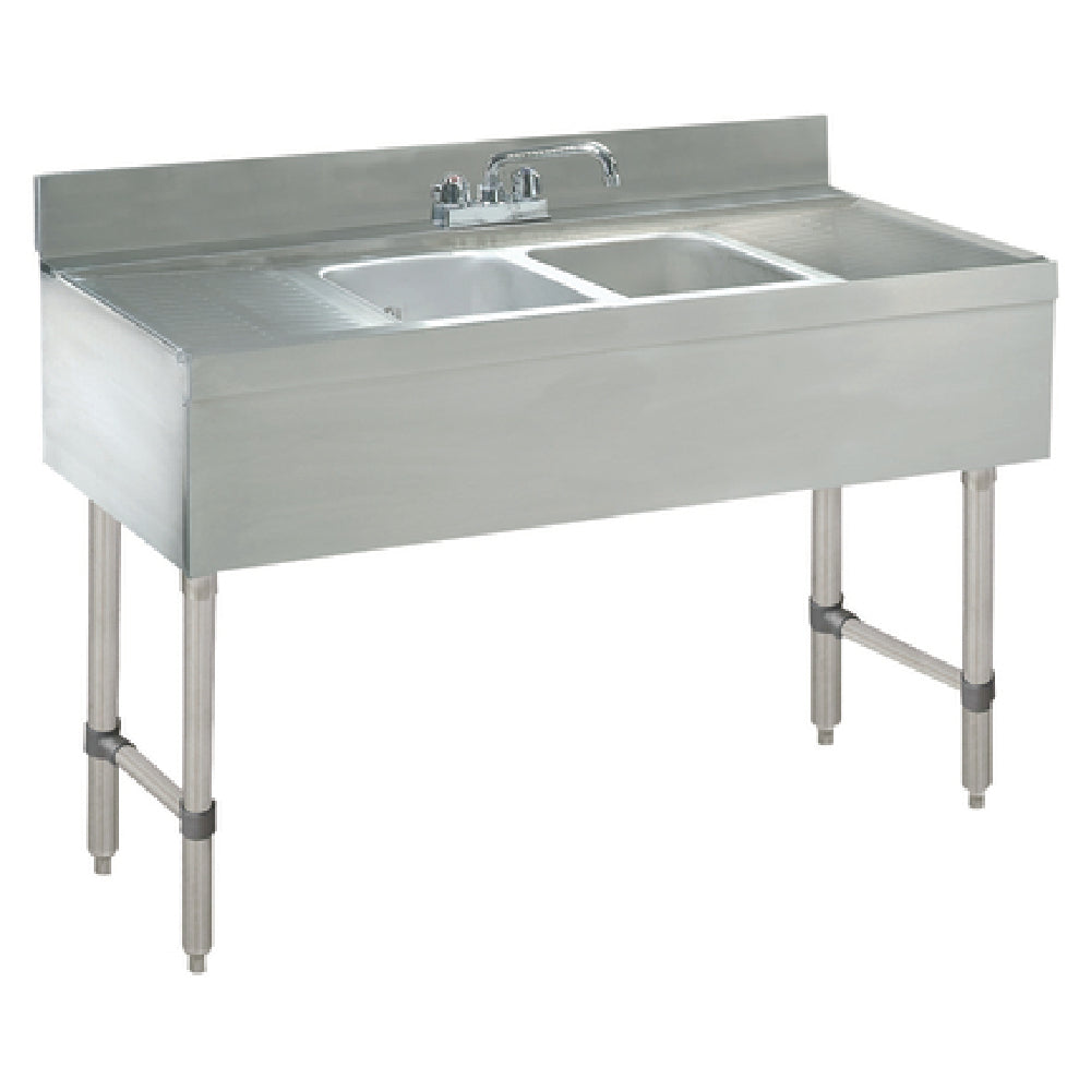 The Advance Tabco CRB-42C Underbar Basics™ Sink Unit is a meticulously designed two-compartment sink unit, measuring 48 inches in width, 21 inches in depth, and 33 inches in height overall. This unit features a 4-inch-high backsplash and incorporates two sink bowls, each 10 inches wide, 14 inches deep, and 10 inches in depth, complete with an overflow pipe for efficient water management. A deck-mounted faucet with a 6-inch spout is centrally positioned for convenient access. On both the left and the right, there are 12-inch drainboards, providing ample space for drying or staging items. Constructed from durable stainless steel, the sink unit is supported by a robust galvanneal understructure, ensuring longevity and resistance to corrosion. The galvanized legs, equipped with front-to-back cross rails and adjustable bullet feet, provide stability on uneven surfaces. This unit is NSF certified, aligning with industry standards for health and safety, making it a reliable choice for bars, restaurants, and other food service establishments looking for a high-quality, efficient, and space-saving underbar sink solution.