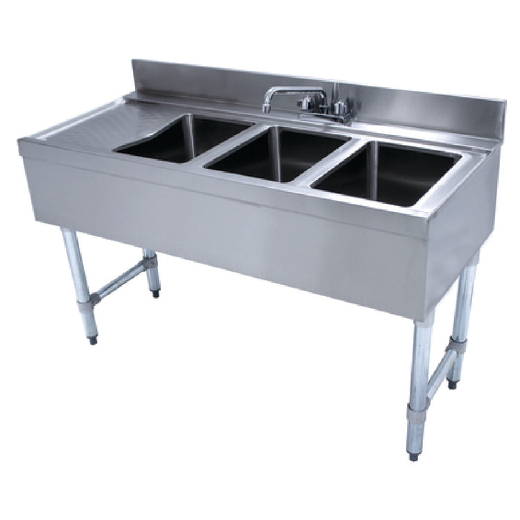The Advance Tabco CRB-43R Underbar Basics™ Sink Unit is a meticulously crafted, high-performance sink unit designed for efficiency and durability in commercial environments. Measuring 48"W x 21"D x 33"H, it offers a practical size for underbar installation while providing ample workspace. This unit features a 4"H backsplash, which helps to contain splashes and maintain cleanliness. It comprises three 10"W x 14"D x 10" deep sink bowls, each with an overflow pipe, enhancing its utility for various washing tasks. The inclusion of a deck-mounted faucet with a 12" spout ensures convenient water access, making it suitable for fast-paced settings. A 9" drainboard on the left side offers additional space for drying or holding items. Constructed from stainless steel with a galvanneal understructure, this sink unit promises long-lasting resilience and corrosion resistance. The galvanized legs, equipped with front-to-back cross rails and adjustable bullet feet, provide sturdy support and stability. Certified by NSF, the Advance Tabco CRB-43R meets rigorous health and safety standards, making it an excellent choice for bars, restaurants, and catering services seeking a reliable, multifunctional sink unit for their operations.